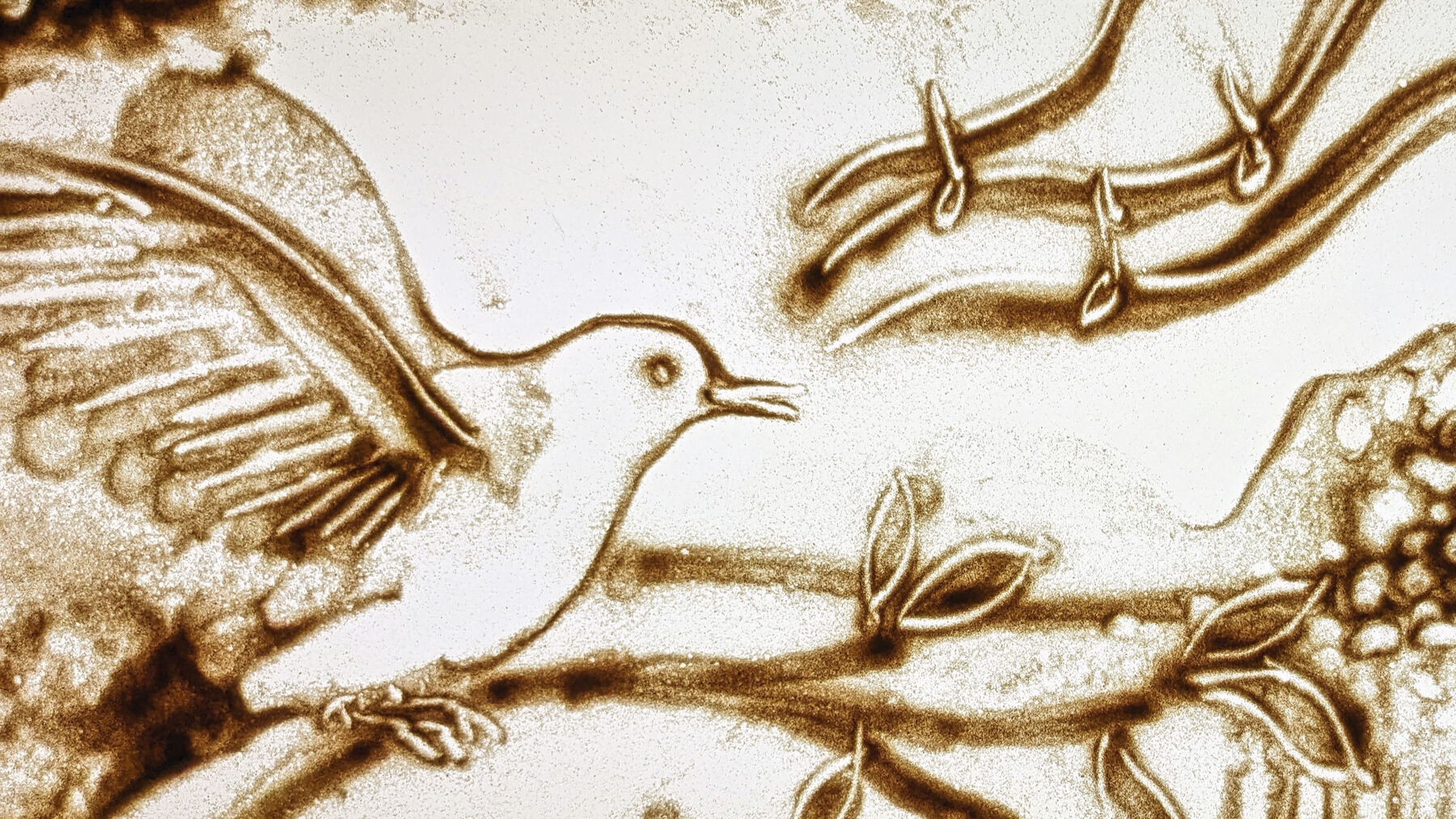 Les tableaux de sable sont inspirés des contes de la tradition orale La femme-phoque et Le vieillard et l’enfant. Un troisième conte, celui de L’oiseau prodigieux est livré à l'oral. Il sert de fil narratif entre les histoires de sable.