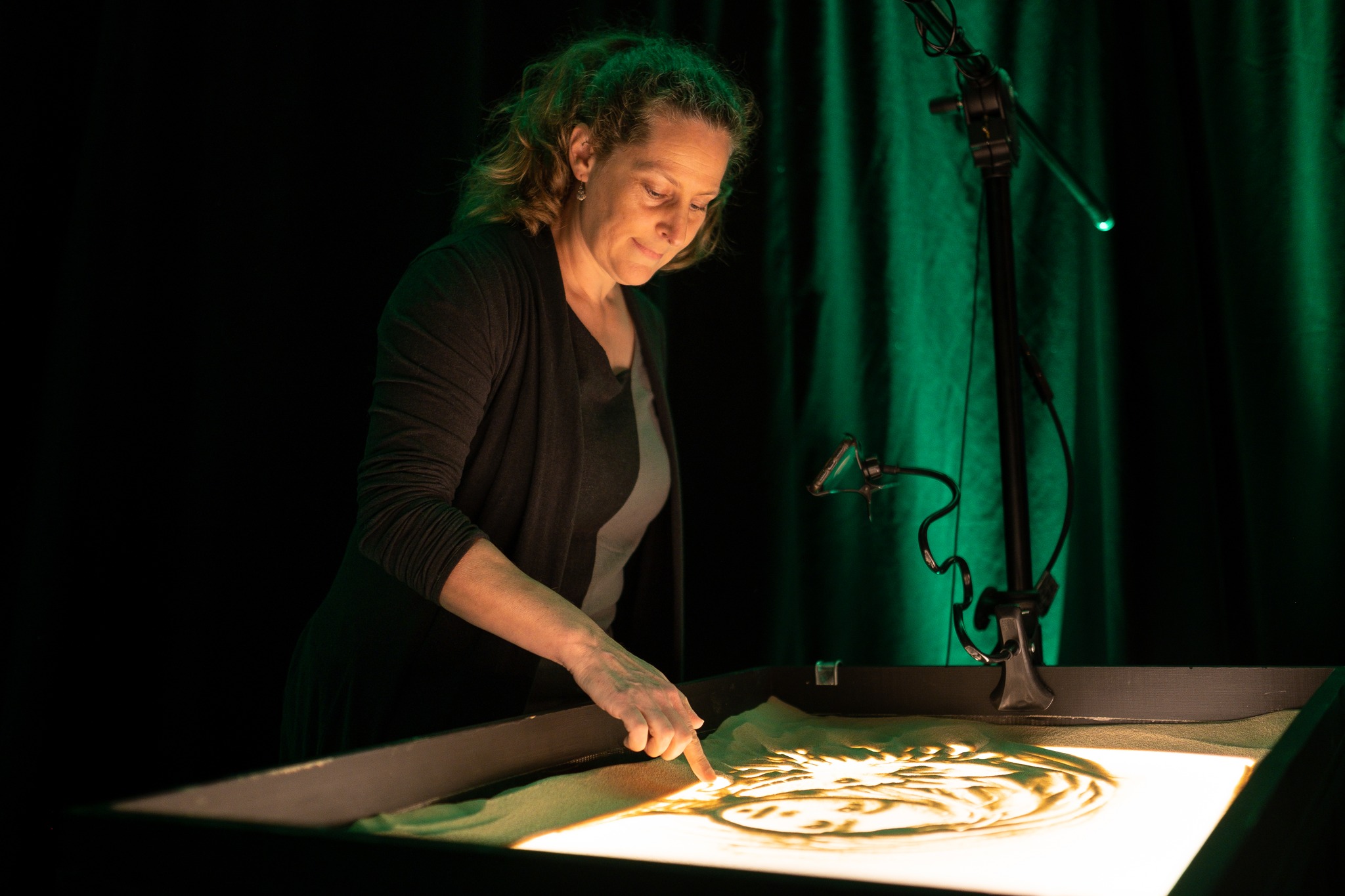 Contes et dessins dans le sable se conjuguent pour offrir une expérience unique. Les dessins, accompagnés de paroles et musique, sont performés en direct sur scène et projetés sur grand écran.
