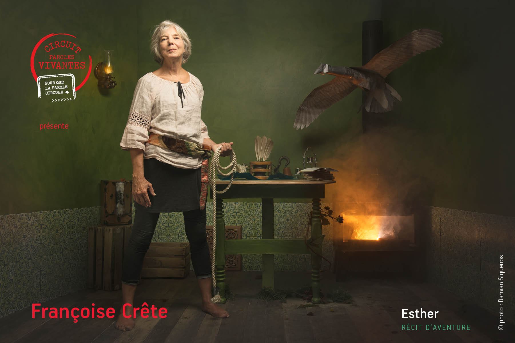 Québec. Grâce à un fil conducteur reliant les diverses histoires, la conteuse vous fera passer par toute une gamme d’émotions, du sourire, à l’intrigue, à la p’tite larme au coin de l’oeil. Elle fait vagabonder ses mots au fil de ses images, en communion avec le public. Dans ce spectacle, ses personnages, surtout féminins, sont avant tout humains, avec leur qualités et leurs défauts, aux prises avec des événements hors de l’ordinaire.
