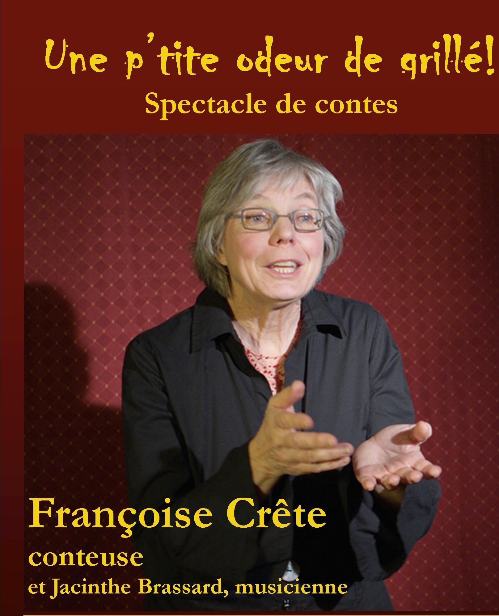 Une p’tite odeur de grillé! est un spectacle clé en main, qui peut s’adresser à un petit groupe de spectateurs comme à un plus large auditoire. Françoise Crête est accompagnée de la musicienne