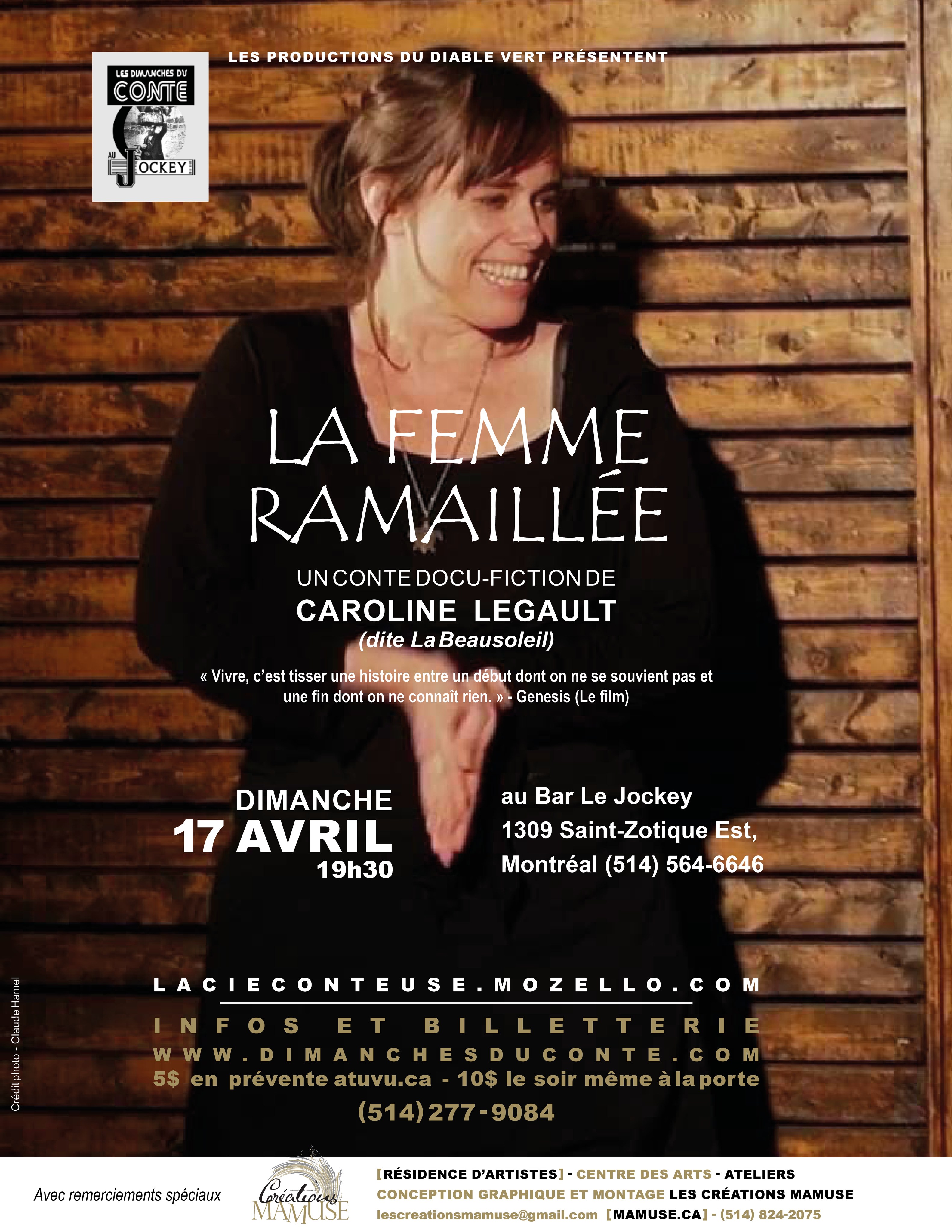 Entre humour et sagesse, Caroline Legault nous fait entendre des contes et récits aux effluves poétiques et empreints de réalisme magique… Comme un hommage aux êtres libres qui ont inspiré la route de la fille qui cherchait sa place dans le monde, jusqu’à devenir … La Femme Ramaillée!