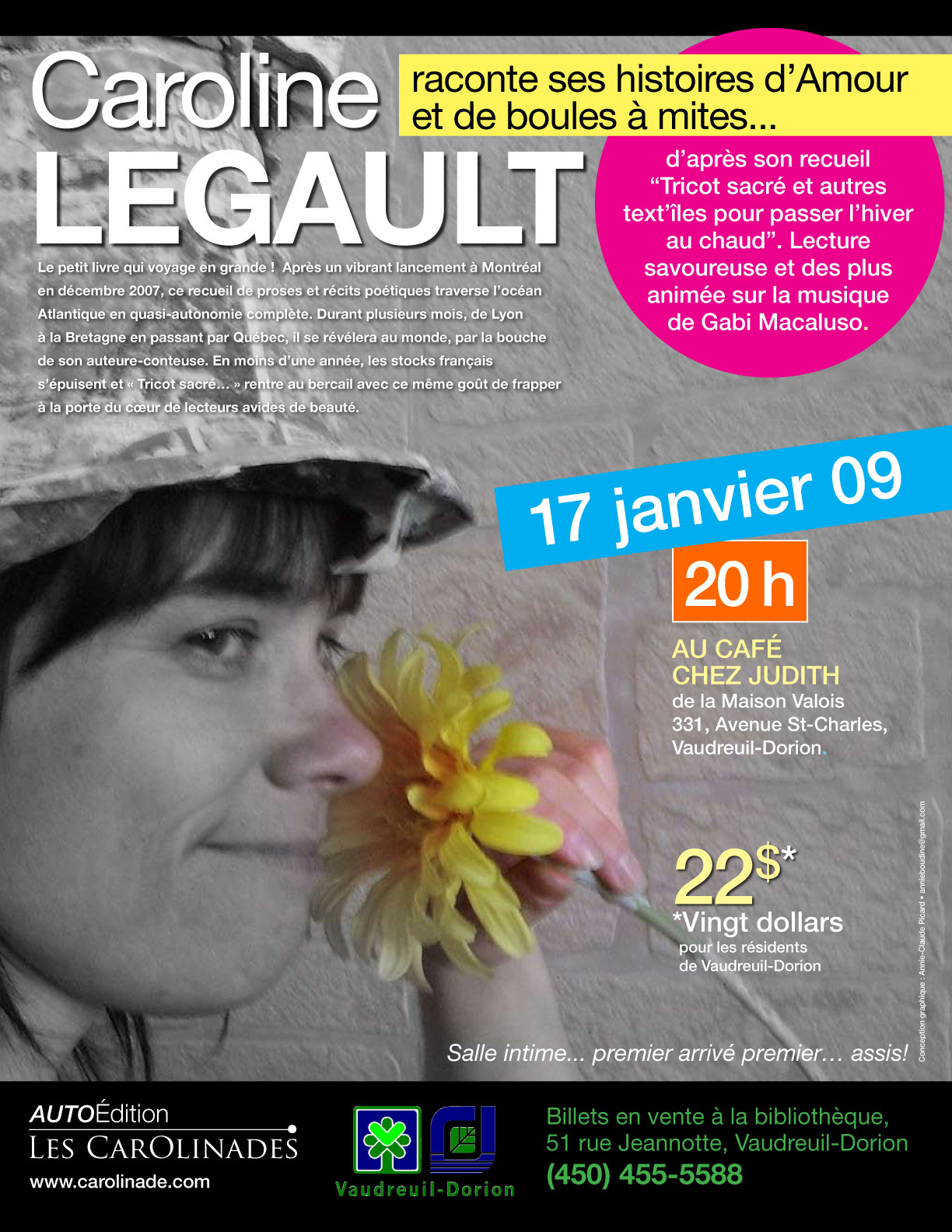 Animatrice tout-terrain au cœur tendre, à l’esprit vif, au nez poétique et aux accents du terroir, Caroline Legault trouve son chemin vers le conte alors qu’en 2004 ses ovaires littéraires lui hurlent d’enfanter les histoires et personnages qu’elle porte. Un premier recueil de proses et récits voit ainsi le jour en 2007. Ce petit livre intitulé « Tricot sacré et autres text’îles pour passer l’hiver au chaud » pousse l’artiste à voyager par-delà sa banlieue montréalaise, ailleurs au Québec et en France. Partout où elle passe, son âme de conteuse est saluée. Depuis, cette originale saisit toutes les occasions qui se présentent pour partager les histoires qui l’enchantent...