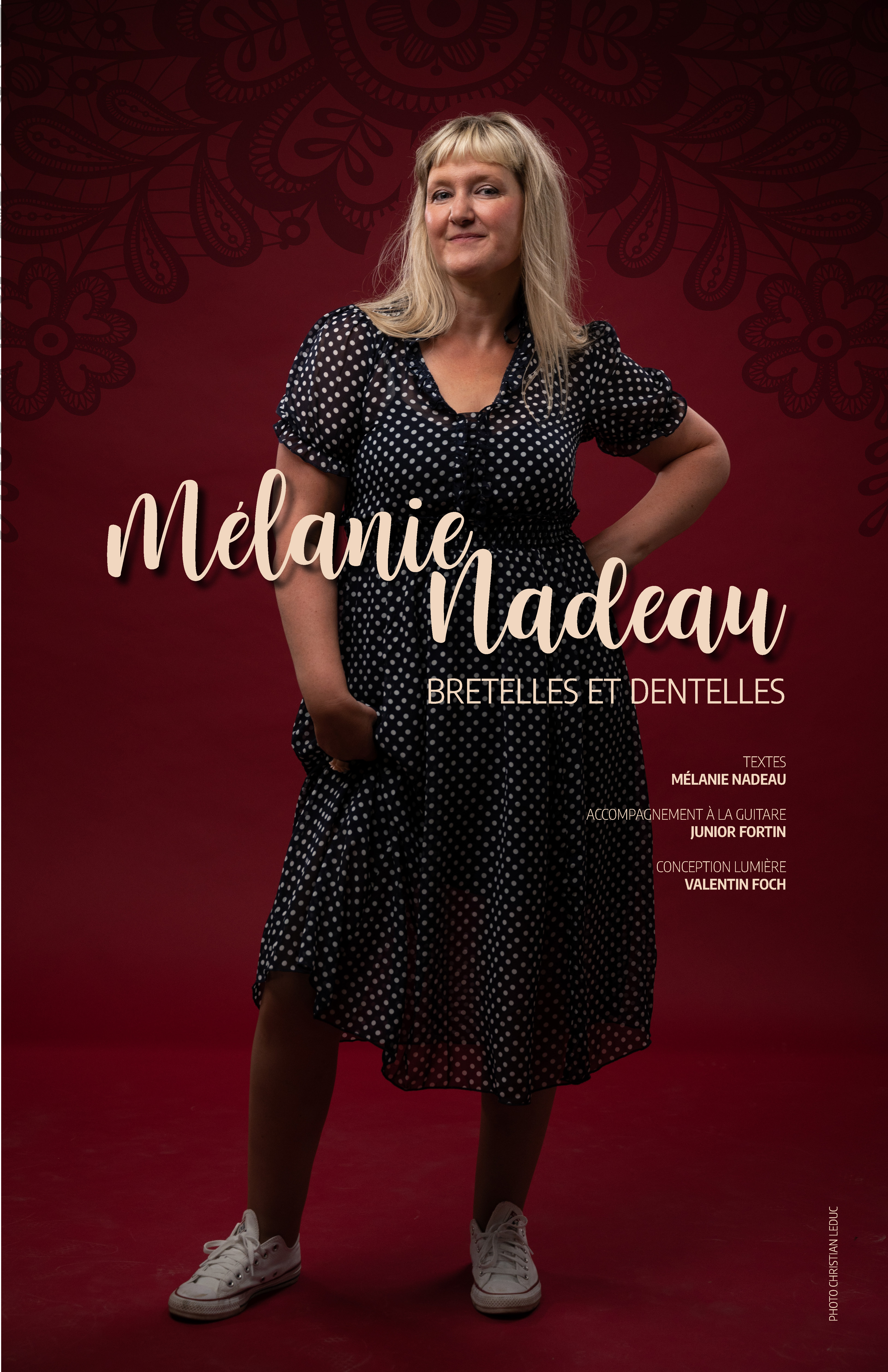 Bretelles et dentelles est un spectacle de contes et musique regroupant cinq courtes histoires écrites et interprétées par Mélanie Nadeau. Vous y découvrirez des personnages attachants remplis de failles mais aussi de lumière : Victor Lafortune un passionné d’Elvis et de péperettes, Armande et Arnaud les deux malaises du party de Noël 78, Marjolaine la transféreuse, Mamie Colette amoureuse de Donald Lautrec ou encore Carlos, un gars qu’on surnomme castor tranquille!