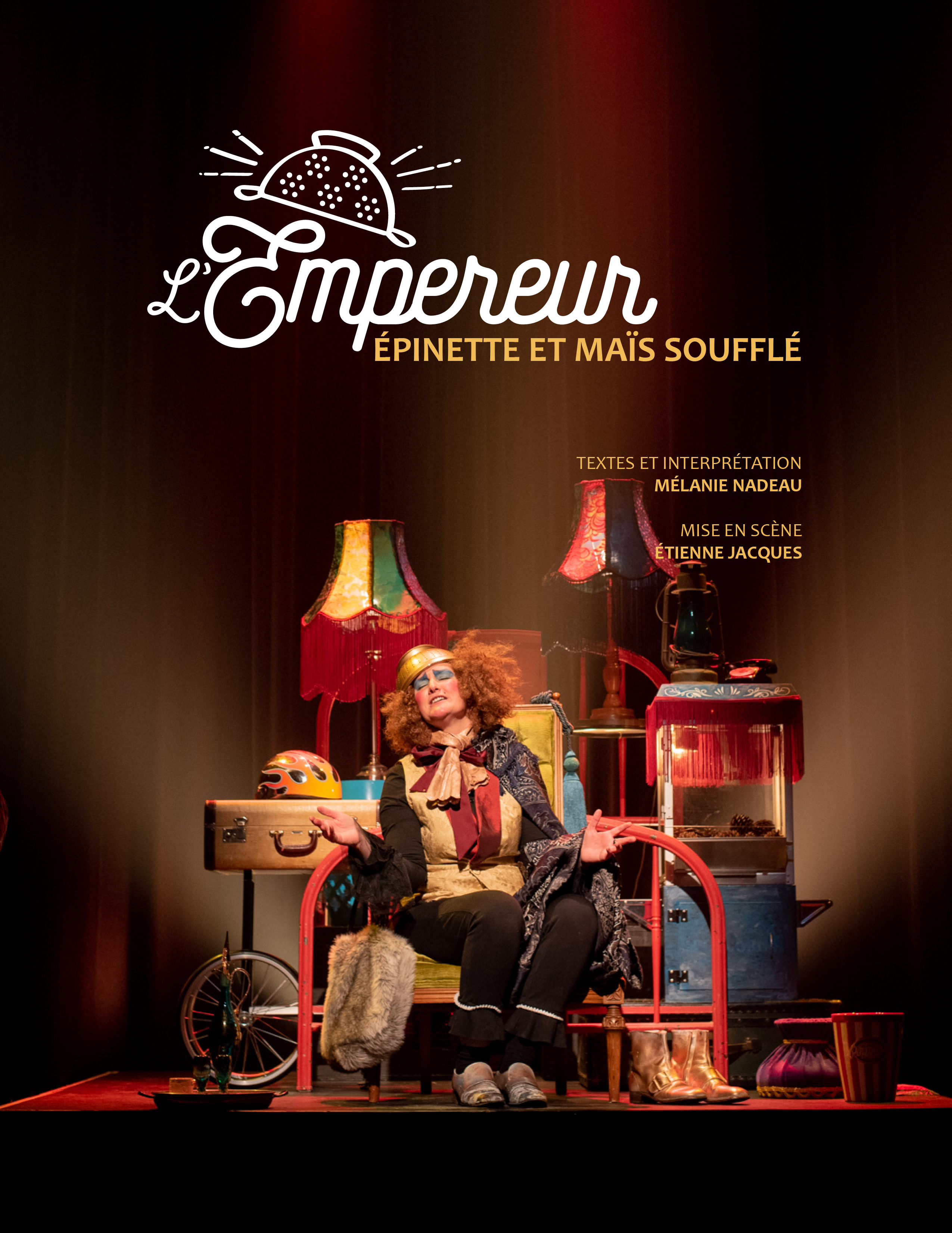 Épinette et maïs soufflé transporte les enfants dans l’univers étonnant de l’Empereur, un conteur pétillant et haut en couleur. Ce personnage coloré invite les enfants à découvrir les multiples personnages vivant dans son empire : Alice et Clarice les grandes mangeuses de réglisse, Orphée aux doigts de fée, Cédric Corbeau le collectionneur de ciseaux et les perroquets Jacasseur et Placoteur.